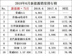 6月份新能源汽车销量:荣威Ei5夺冠,比亚迪宋DM同比销量下滑
